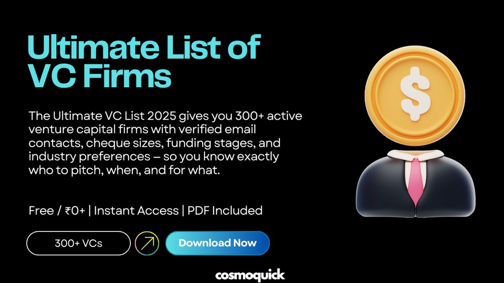 Stop guessing which VC to pitch. The Ultimate VC List 2025 gives you 300+ active firms with verified contacts, investment thesis, sector & stage focus, geo, typical check sizes, portfolio highlights, founder-friendly content links, and warm intro paths. Curated and formatted for fast outreach—so you can build a targeted pipeline, personalize emails, and book real meetings. Built by Cosmoquick for founders who value speed, signal, and fit.